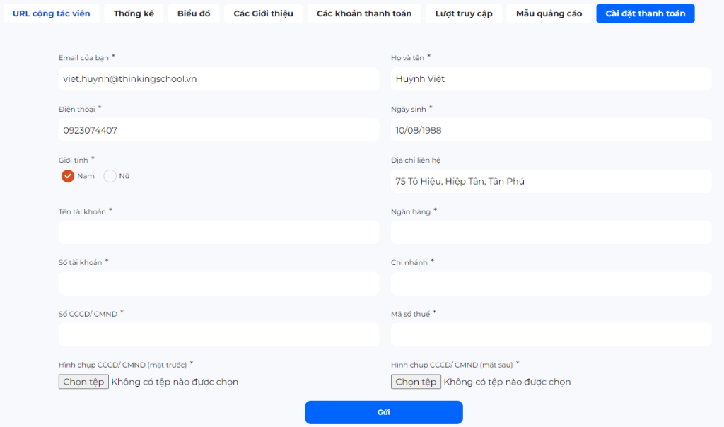 9. Cài đặt thanh toán: Ở bảng này bạn có cập nhật thông tin thanh toán của mình.