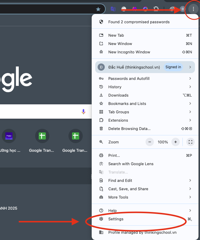 - Tiến hành truy cập vào cài đặt trình duyệt (Setting) bằng cách: ấn vào dấu 3 chấm ở góc phải trên trình duyệt, chọn đến Setting