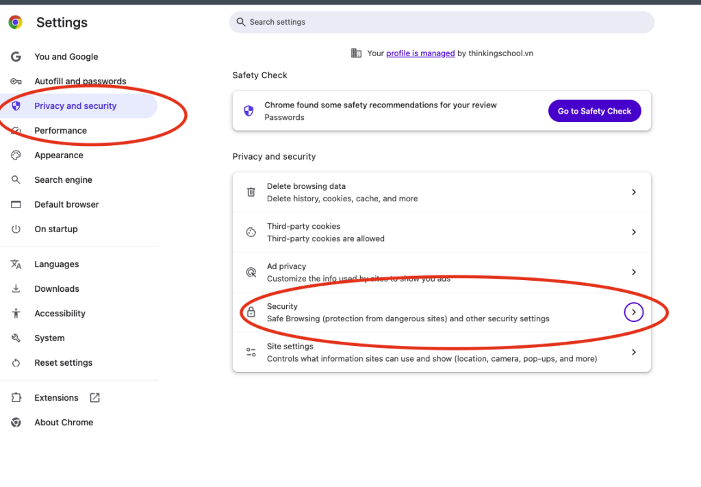 Bước 2: Tiến hành chọn đến mục Security trong setting trình duyệt Chrome